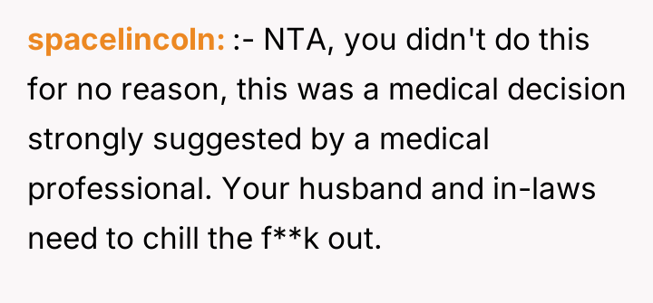 The original poster (OP) is facing significant conflict because she prioritized her health decision to remove a hormonal contraceptive implant without prior discussion, leading her husband and his family to fear she intends to conceive without his agreement. Her actions, taken quickly due to medical timing and a desire to avoid hormones, directly clashed with her husband's expectation of continuous, reliable contraception, escalating the situation into an issue of trust and control over reproductive decisions.