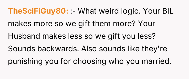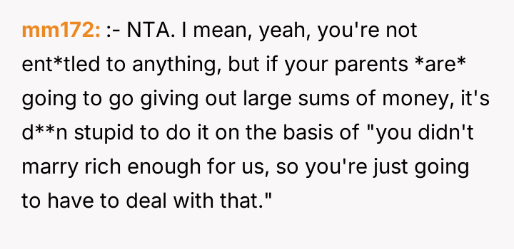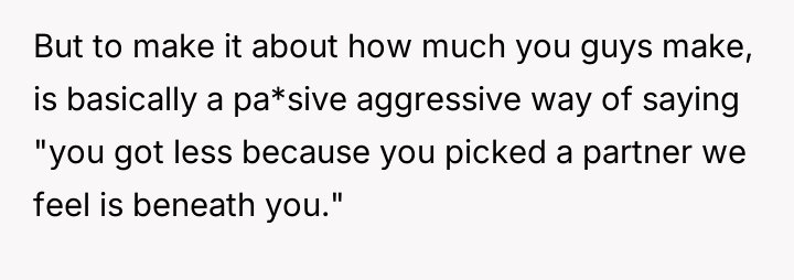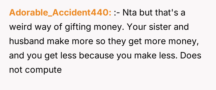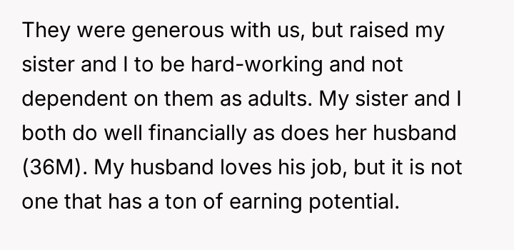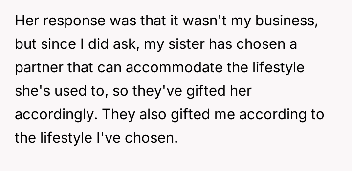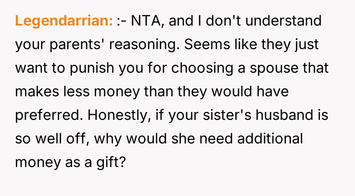 The parents' motivation appears rooted in a perceived social or financial hierarchy, explicitly linking the gift size to the son-in-law's earning potential and the lifestyle it supports. This action implies a judgment on the OP's partner and, by extension, the OP's choices. The sister’s action of revealing the amounts, while perhaps intended to create transparency, inadvertently triggered the OP’s feelings of inequity. The OP’s hurt stems from equating financial support with parental validation. While parents are not legally required to give equal gifts, significant disparities based on subjective criteria like income potential often damage sibling dynamics and create resentment.
