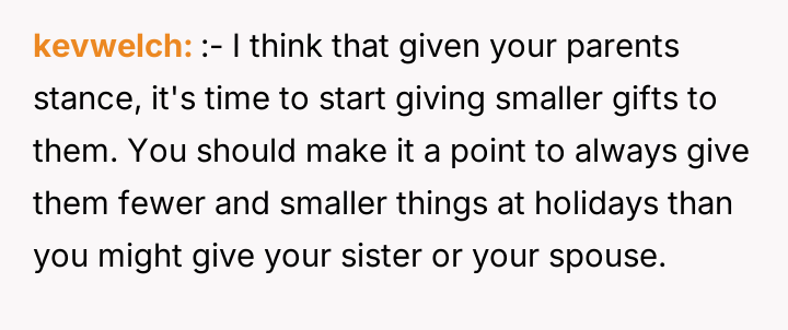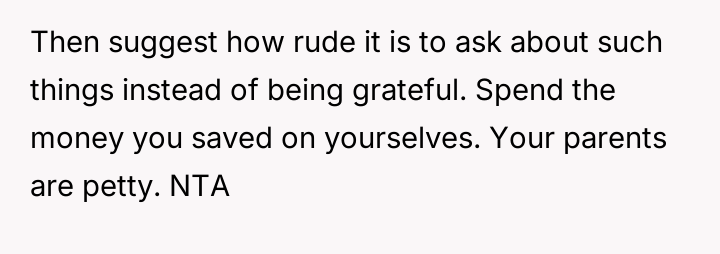 The OP’s action of confronting their mother was understandable given the emotional sting of the discovery, but it escalated the situation. Moving forward, the OP should focus less on the dollar amount and more on establishing healthy communication boundaries with the parents regarding unsolicited criticism of their life choices. A constructive approach would involve having a calm conversation with the parents, not about the money itself, but about how their decision made the OP feel unseen or less valued, separating the gift from the relationship itself.