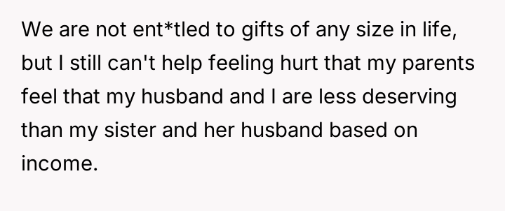 The original poster (OP) is grappling with feelings of being undervalued or judged by their parents following the revelation of unequal wedding gifts, which were explicitly tied to their spouse's lower earning potential compared to their sister's. The central conflict lies between the OP's expectation of equal parental love and support versus the parents' belief that financial gifts should reflect the perceived lifestyle compatibility of the recipients' chosen partners.