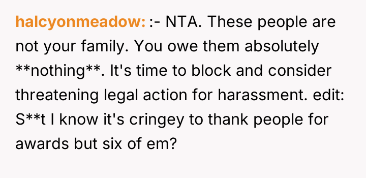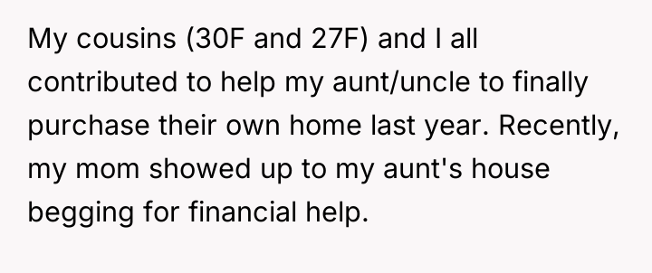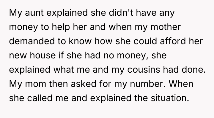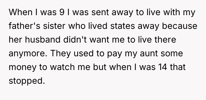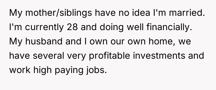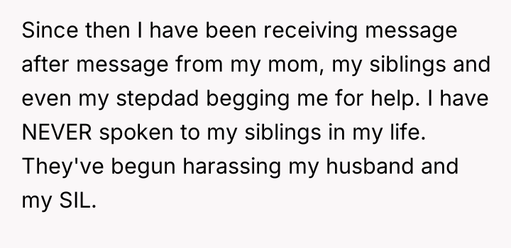 The OP's life trajectory—being sent away, unsupported financially by their biological mother after age 14, yet succeeding through personal effort and the support of extended family (the aunt/uncle/cousins)—sets up a clear dynamic. The mother and half-siblings operated under the assumption of familial entitlement, ignoring the OP for years while enjoying a privileged lifestyle. Their current actions are not rooted in genuine reconciliation or relationship-building; they are purely transactional, triggered by financial crisis. The ensuing harassment directed at the OP's spouse and extended support network demonstrates a severe lack of respect for the OP's established adult life and boundaries.