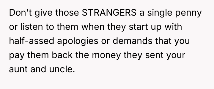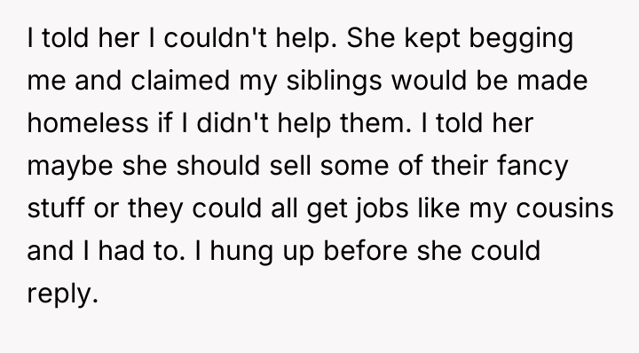The OP's initial decision to refuse aid and hang up was an appropriate, self-protective measure against emotional manipulation and financial exploitation. The feeling of guilt is a common emotional response when confronting deeply ingrained societal or familial expectations of unconditional support, even when those expectations were never reciprocated. The constructive recommendation is for the OP to cease all direct communication immediately and use their aunt or cousins (who have established relationships) as a buffer if any response is absolutely necessary. The priority must remain protecting their marriage and investments from this predatory behavior, viewing the past abandonment as concrete evidence that no reciprocal relationship exists to uphold.