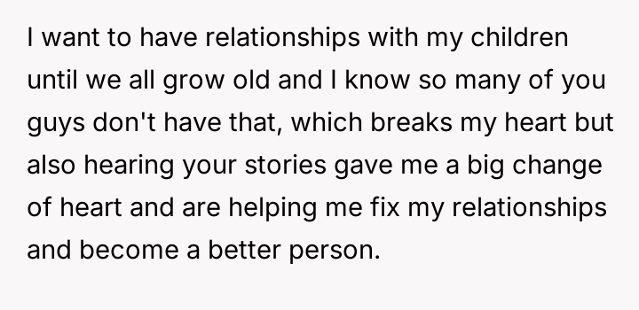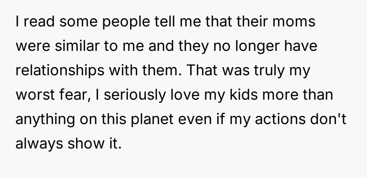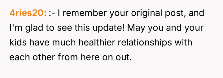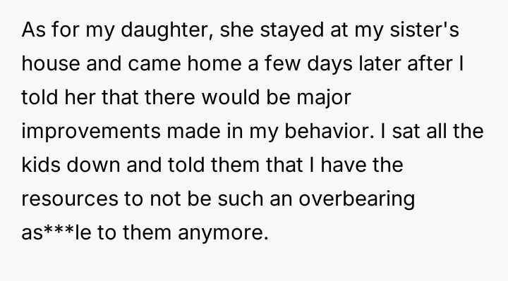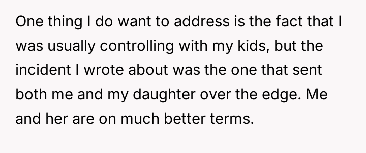 The original poster experienced a significant crisis of conscience after public feedback revealed the severity of their controlling behavior, prompting intense emotional distress and fear of losing their children. This realization led the OP to actively seek professional help and commit to substantial behavioral changes to repair their family relationships.