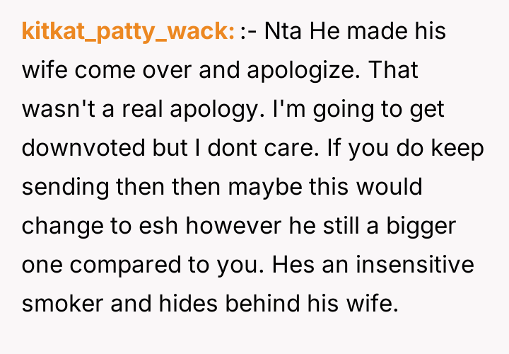 Given that the neighbor's wife has formally apologized on his behalf, is the OP's continued, symbolic retaliation justified as a final stand for respect, or has the ongoing act of mailing the butts transformed the situation from seeking resolution into unnecessary escalation that demands immediate cessation?