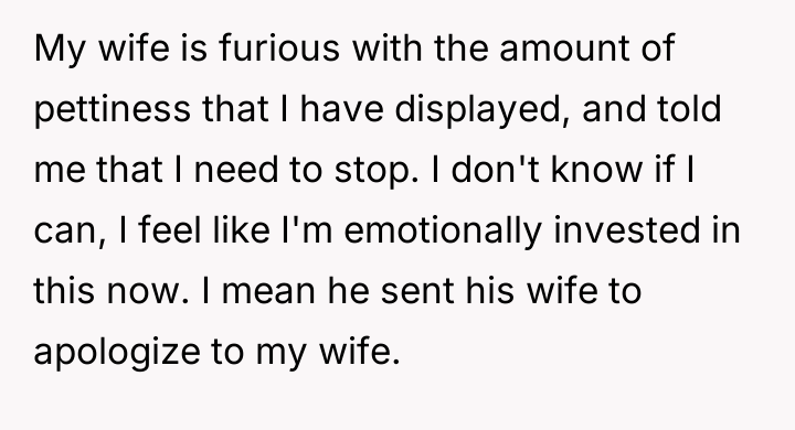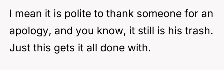 Now, trapped in a petty war of notes and unspoken grudges, he finds himself emotionally entangled in a battle that feels bigger than the trash itself. The neighbor’s wife’s apology only stokes the embers of his frustration, as the absence of a direct, honest confrontation leaves him wrestling with a mix of anger, pride, and a desperate need for respect that remains painfully unmet.