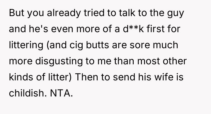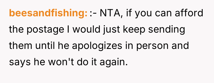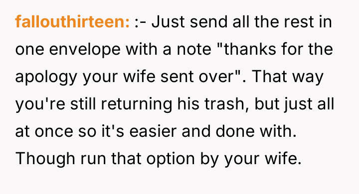 As renowned researcher Dr. Brené Brown explains, “Boundaries are the distance at which I can love you and me simultaneously.” In this scenario, the initial boundary violation by the neighbor (littering and subsequent verbal abuse) was severe. The OP's initial response—politely asking for cleanup—was appropriate boundary setting. However, the shift from seeking rectification to engaging in calculated, prolonged retaliation (mailing 47 butts one by one) demonstrates an emotional investment that has overridden effective conflict resolution. The core issue has moved from property damage and rudeness to establishing control and seeking emotional satisfaction. The neighbor exhibited poor character by refusing a direct apology and delegating his wife to apologize, which naturally fueled the OP's feelings of being disrespected man-to-man. However, the ongoing mailing of trash places the OP in a morally equivalent, though less physically damaging, position of pettiness, which the spouse correctly identified as harmful to the OP's standing. The OP's actions were an understandable, yet ultimately counterproductive, response to feeling slighted. The professional recommendation is to cease the mailing immediately. The apology from the wife, even if mediated, serves as a sufficient external acknowledgment of the wrong. Future conflicts should be managed by clearly stating boundaries once and, if immediately violated, involving impartial third parties (like homeowner association mediation or local non-emergency services for repeated nuisance) rather than entering long-term, secretive acts of passive aggression.