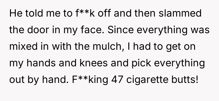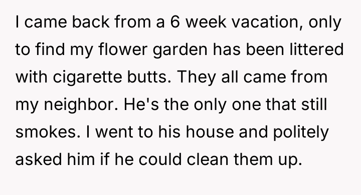 After returning from a long-awaited vacation, he was greeted not by the calm beauty of his flower garden, but by the careless scars of cigarette butts scattered like wounds left behind by a neighbor’s disrespect. The silent fury of having to crawl on hands and knees to pick up 47 remnants of thoughtlessness ignited a fire within him, a quiet rebellion against the blatant disregard for his sanctuary.