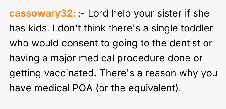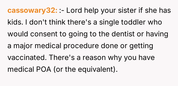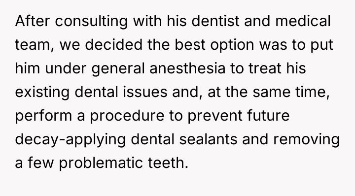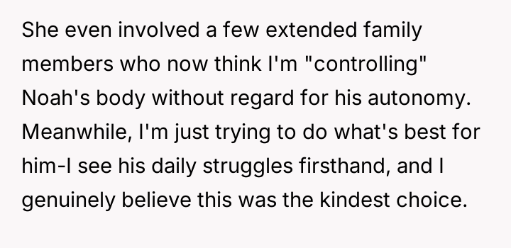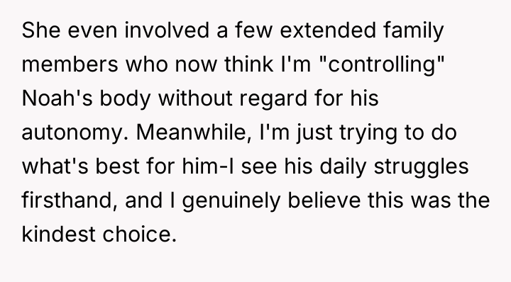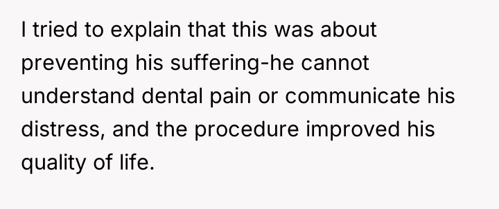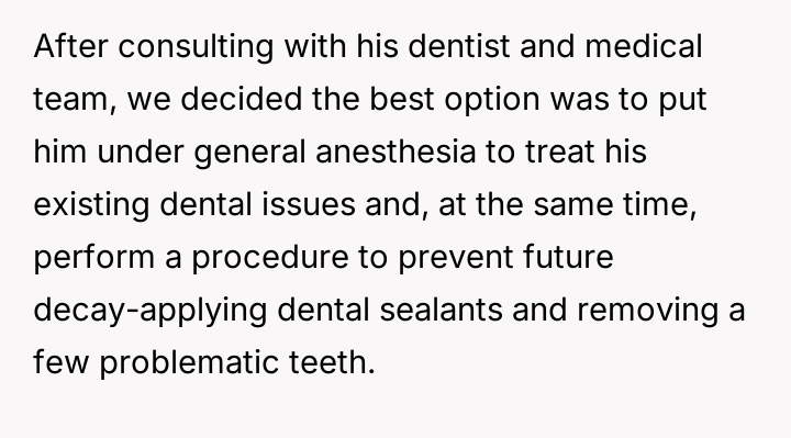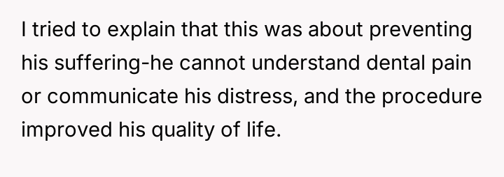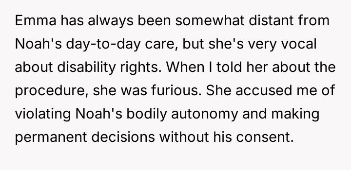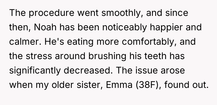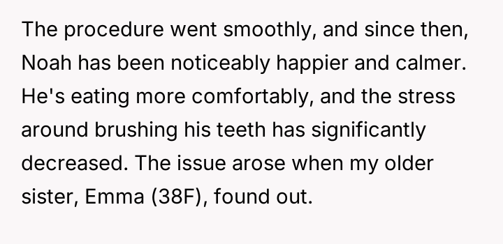 After consulting with medical professionals, the OP decided to place Noah under general anesthesia to address existing severe dental issues and apply preventative measures like sealants and tooth removal. Although the procedure significantly improved Noah's comfort and quality of life, the OP's older sister, Emma (38F), reacted with intense anger, accusing the OP of violating Noah's bodily autonomy. Now, facing accusations from his sister and other family members that he was being controlling, the OP doubts if he made the right ethical decision.