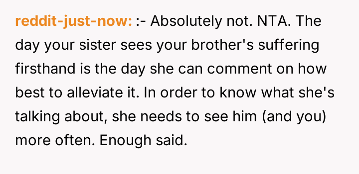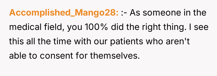 The core conflict centers on the OP's responsibility as a caregiver versus the abstract concept of autonomy for an individual who cannot express consent or understand future consequences. The OP acted based on observable, immediate relief of suffering, while his sister prioritizes a principle of bodily integrity, viewing the OP's decision as overreaching authority.
