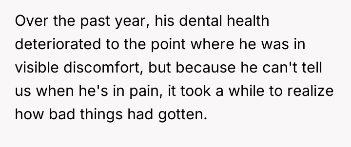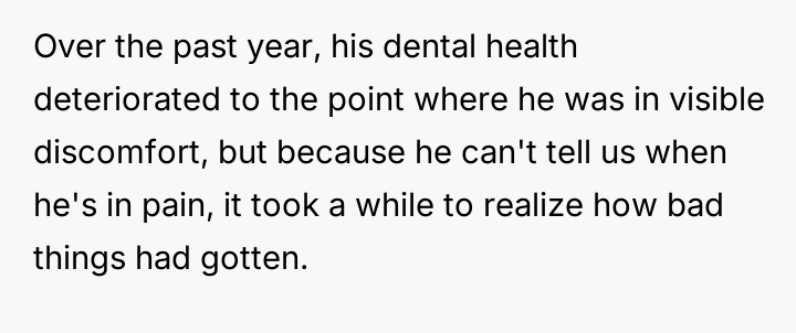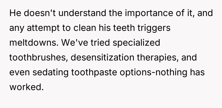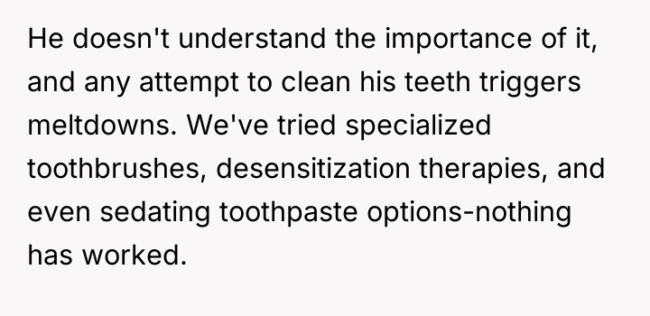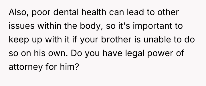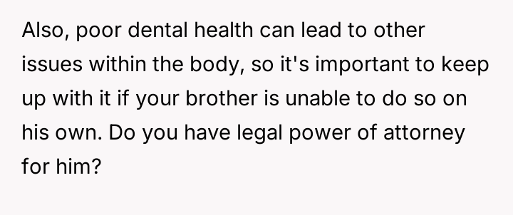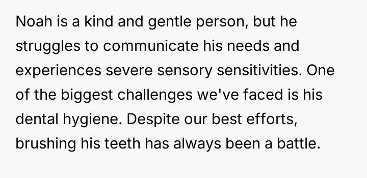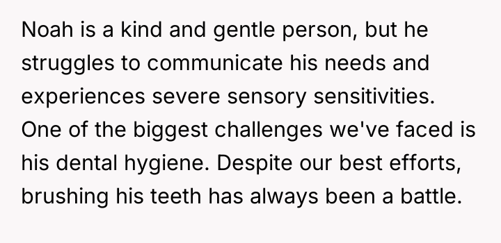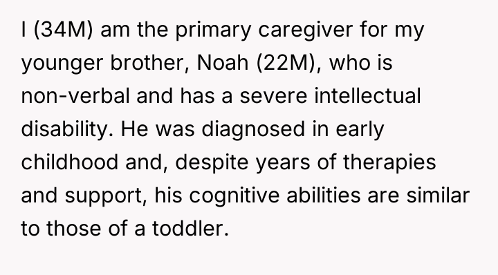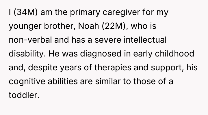 The user, a 34-year-old male (OP), is the primary caregiver for his younger brother, Noah (22M), who has severe intellectual and non-verbal disabilities similar to those of a toddler. A major recurring challenge has been maintaining Noah's dental hygiene, as attempts to brush his teeth trigger severe meltdowns due to his sensory sensitivities.