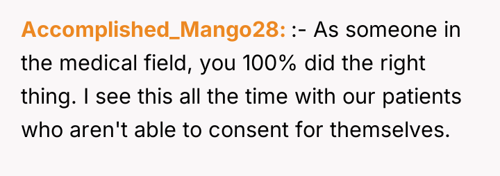 The OP's action, supported by medical consultation, appears appropriate as a necessary, compassionate response to prevent ongoing suffering. Moving forward, the OP should continue to document all medical rationale thoroughly and engage with Emma not by defending the action, but by sharing the objective, measurable improvements in Noah's daily functioning post-procedure to re-establish trust and shared understanding of the 'best interest' standard.