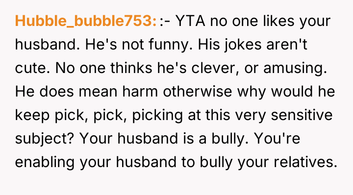 The original poster finds herself caught between supporting her husband, who insists his offensive jokes are harmless humor, and her brother's family, who were deeply hurt by the persistent targeting of a sensitive subject—their adopted son's biological parents. The conflict escalated dramatically when the husband made a profoundly inappropriate joke at a family gathering, leading to his ejection and a subsequent family rift.