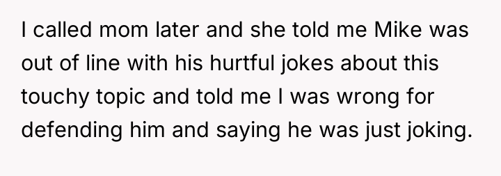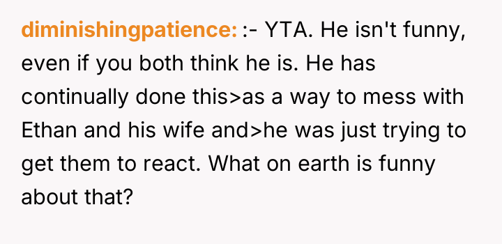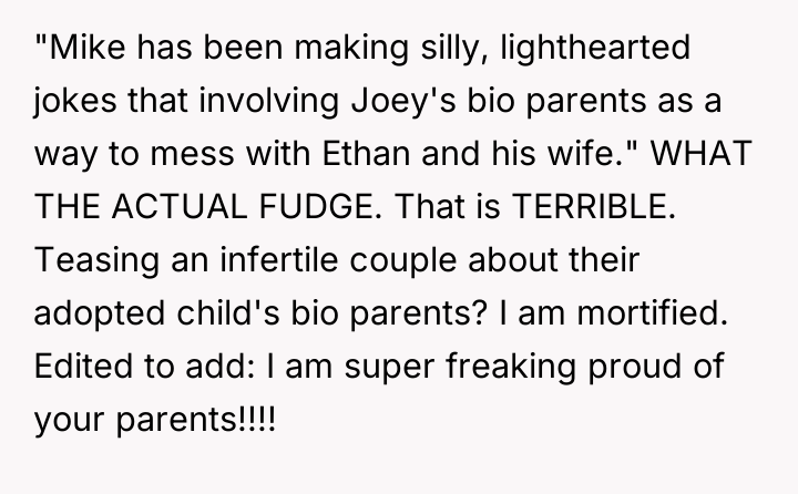 As renowned social psychologist Dr. Harriet Lerner explains, “When we make jokes at the expense of someone else’s deepest vulnerabilities, we are not connecting; we are creating distance and inflicting pain.” The core issue here is a profound failure in emotional regulation and boundary recognition by the husband, Mike. While he may perceive his actions as lighthearted teasing aimed at eliciting a reaction, the repeated targeting of the adoption topic moves beyond humor into emotional harassment, especially given prior warnings from the brother, Ethan. Adoption, particularly concerning biological parents, is often a complex and sensitive issue tied to identity and history, making it an inappropriate subject for relentless joking. The wife's initial defense of Mike highlights a common dynamic where the partner prioritizes excusing the behavior over validating the pain of the offended party. The family's reaction, though perhaps severe in execution (asking him to leave immediately), was a direct response to a pattern of disrespect that culminated in a public violation of a clear emotional boundary. The poster's attempt to shift blame to her parents for 'escalating' the situation fails to acknowledge that Mike's joke was the initial, deliberate escalation. For future effectiveness, the poster must prioritize empathy for the victims (Ethan and his wife) over defending Mike's intent. A constructive path forward involves Mike offering a sincere, unconditional apology focused solely on the pain caused, without referencing the 'it was just a joke' defense, and establishing firm, non-negotiable rules regarding sensitive family topics. The situation demonstrates a clear imbalance of power and respect. When one party repeatedly ignores clear negative feedback, the offended party is justified in creating immediate distance to protect their emotional well-being.