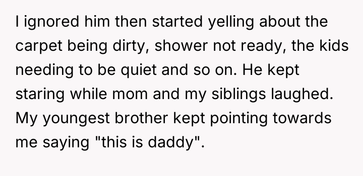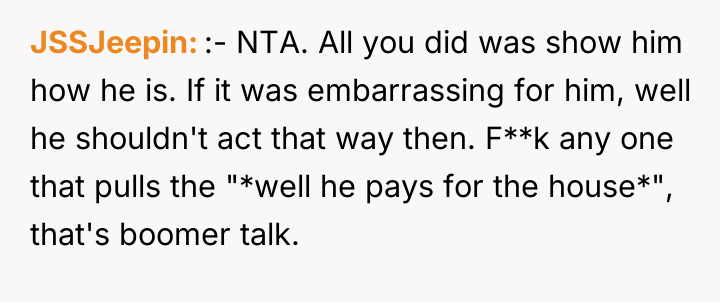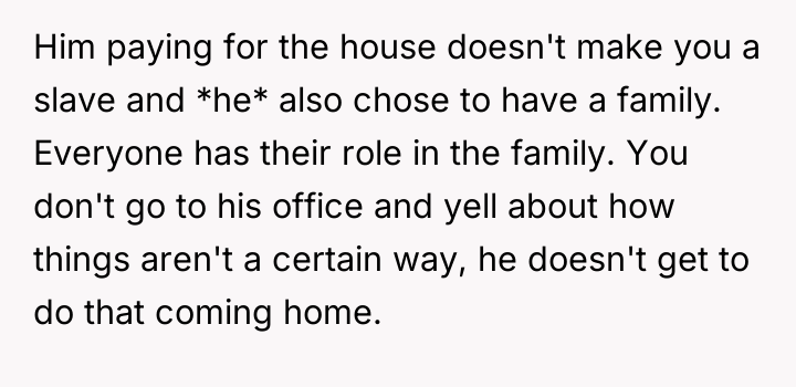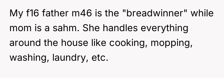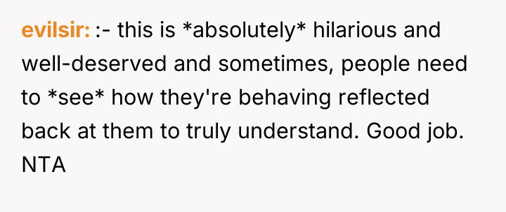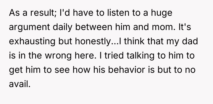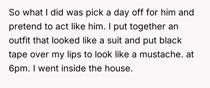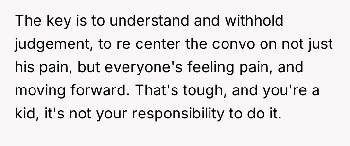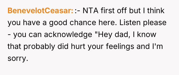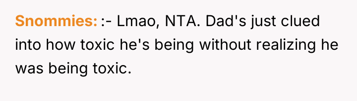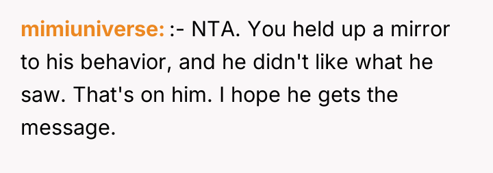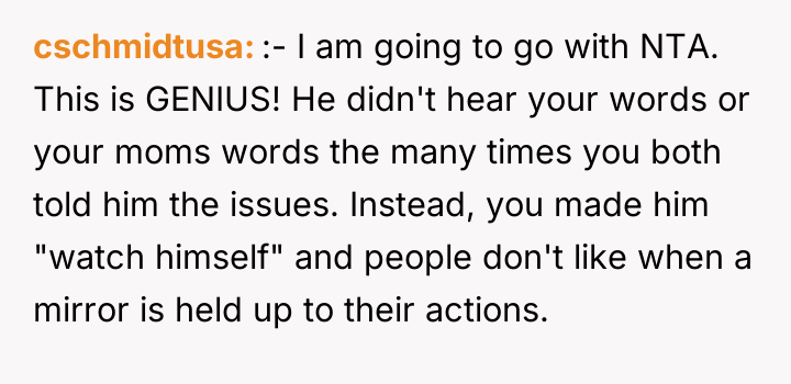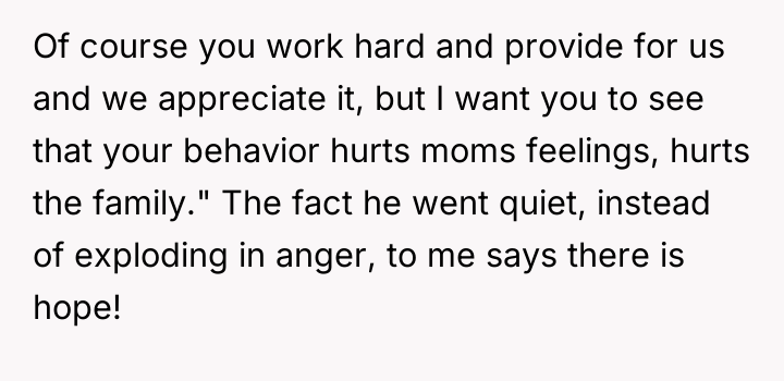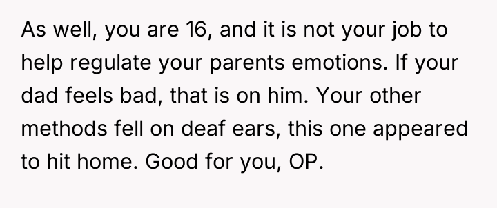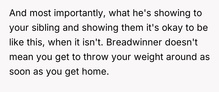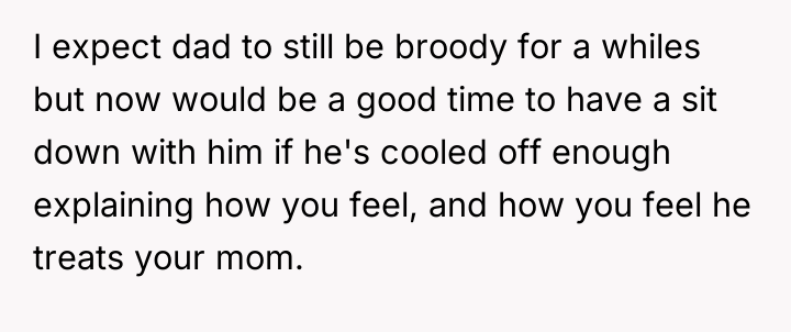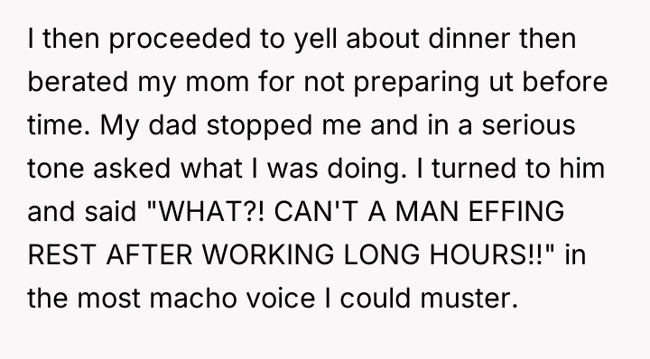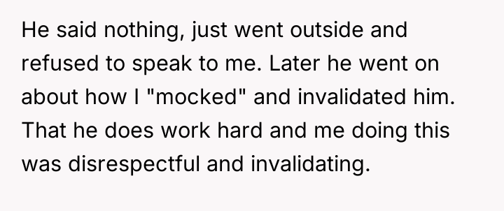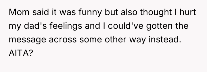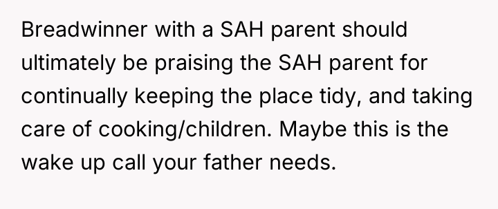 As renowned family therapist Dr. Susan Forward explains, “When we feel powerless to change a situation, we often resort to passive-aggressive or disruptive tactics because direct communication has failed.” The OP's behavior, while disruptive, appears rooted in frustration over failed direct communication attempts with the father, who seems to be displacing work-related stress onto the home environment. The father’s role as the primary financial provider (the 'breadwinner') may be fueling a sense of entitlement regarding the domestic order, leading him to ignore the significant emotional and physical labor contributed by the mother and the OP. The OP’s performance successfully disrupted the father’s routine and forced an immediate, albeit negative, reaction. However, using mockery—even for a clear instructional purpose—often triggers defensiveness rather than introspection, as evidenced by the father labeling the act as 'disrespectful and invalidating.' While the OP effectively highlighted the pattern, the execution likely damaged the immediate relationship, validating the mother's concern that a different approach was needed. For future situations, the OP could focus on using 'I' statements directed toward the *impact* of the behavior (e.g., 'When you complain about cold food immediately upon arrival, I feel demoralized because I worked hard to prepare it'), rather than impersonating the source of the frustration. This shifts the focus from personal attack to shared problem-solving regarding household expectations.