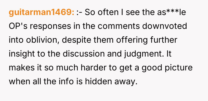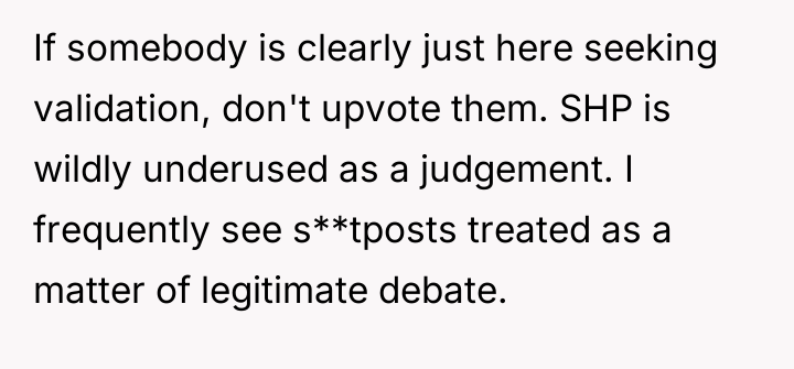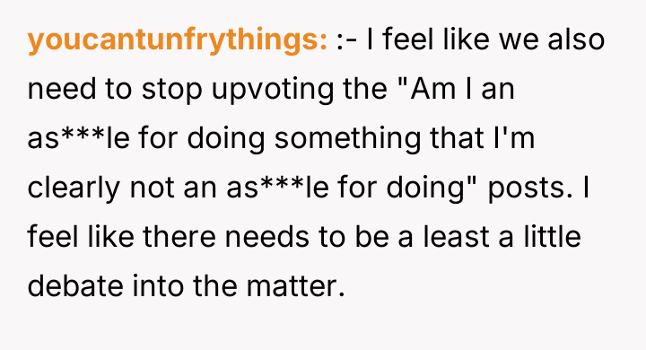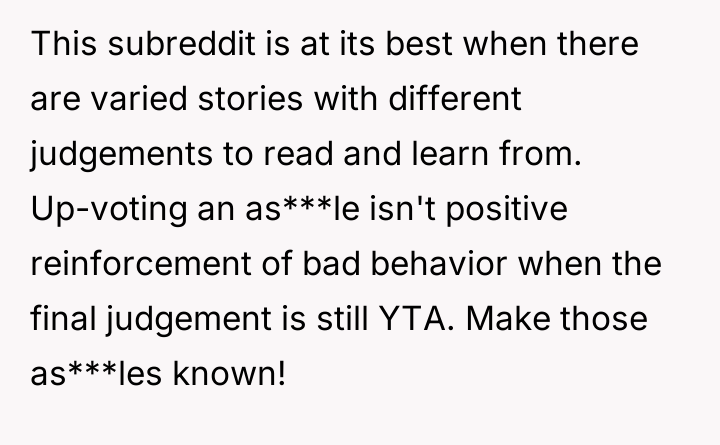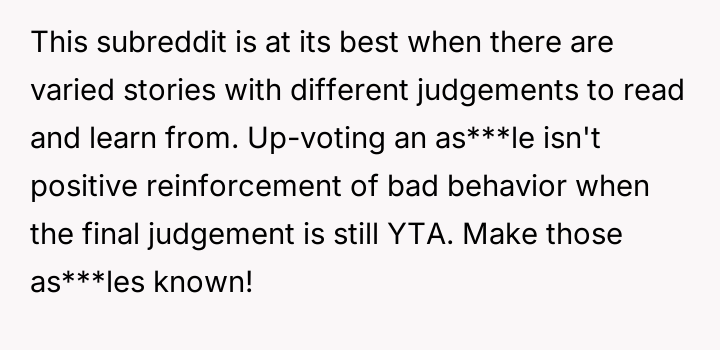 As renowned social psychologist Dr. John Gottman explains, 'Communication is not just about what you say, but how you say it, and what you don't say.' The OP's text highlights a meta-discussion about community norms and content curation, rather than a direct interpersonal conflict. The OP values dialectical tension—the presence of diverse judgments (YTA, NTA, ESH) as essential for the forum's utility and learning potential. The observed trend towards NTA posts suggests a current audience preference for validation or simpler moral scenarios. This dynamic can create an echo chamber effect where difficult or morally gray situations, which often lead to a YTA verdict, are less visible or downvoted, potentially stifling the critical analysis the OP seeks. The OP's action of calling out the trend itself is an attempt to rebalance the platform's discourse, which is appropriate for expressing a perspective on community health. A more constructive approach in future instances might be to engage directly with the content that receives high visibility, perhaps by adding detailed counterpoints or explanations as comments on popular NTA threads, rather than solely focusing on the voting distribution itself.