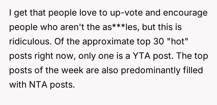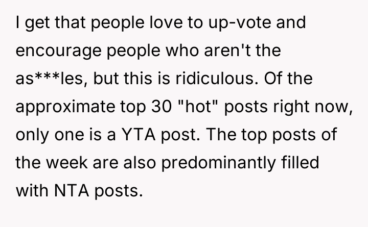 The original poster expresses frustration that the subreddit's current trending posts heavily favor non-conflict situations or clear justifications for the poster's behavior (NTA judgments). The central conflict lies between the OP's belief that the subreddit thrives on varied, challenging judgments (including YTA votes) and the community's current tendency to reward posts where the original poster is clearly not at fault.