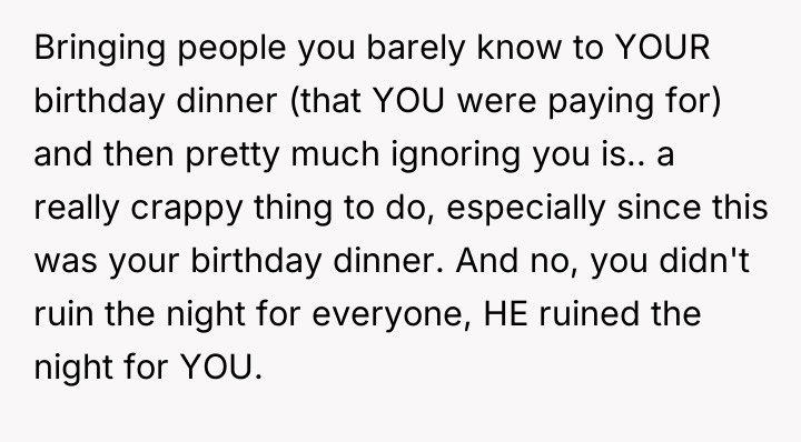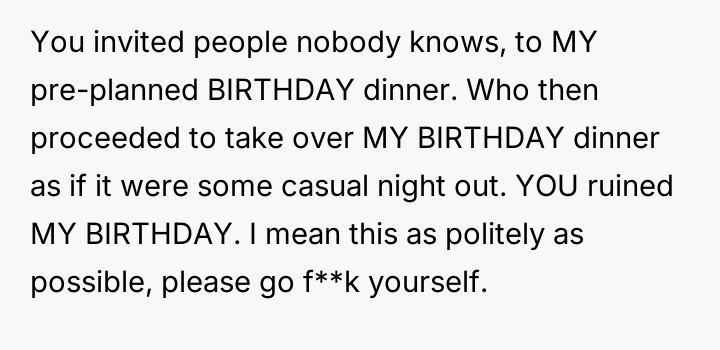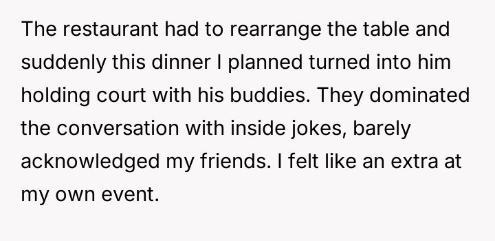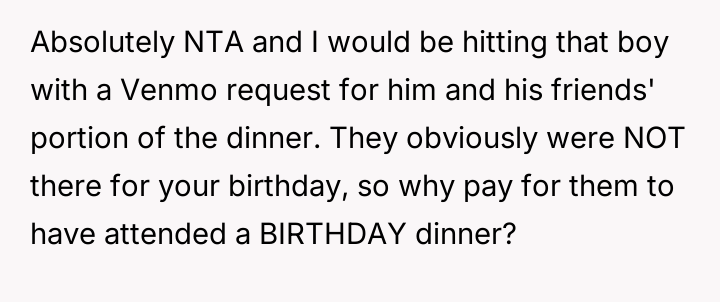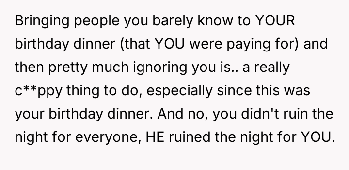 AITAH for leaving my own birthday dinner early after my boyfriend showed up with three of his friends uninvited?