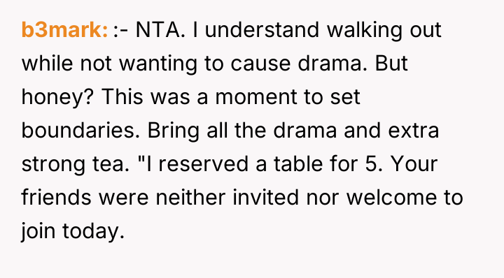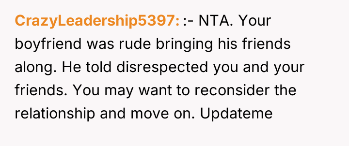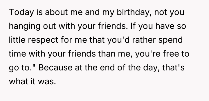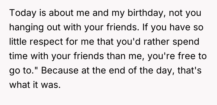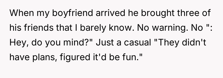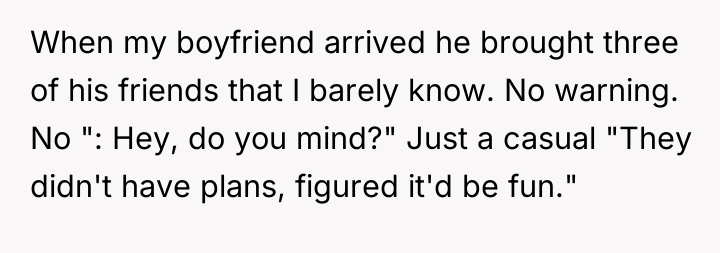 The boyfriend’s behavior demonstrates a failure in respecting boundaries and a lack of consideration for the OP’s emotional labor in planning the event. By inviting three unannounced guests and allowing them to dominate the atmosphere, he minimized the significance of the OP's milestone and her existing friendships. The OP’s decision to leave, while perhaps emotionally driven, was a direct consequence of feeling completely unheard and invalidated in a setting meant to honor her. Her action served as a final, albeit dramatic, attempt to reclaim control and express her distress when verbal communication failed to change the situation.