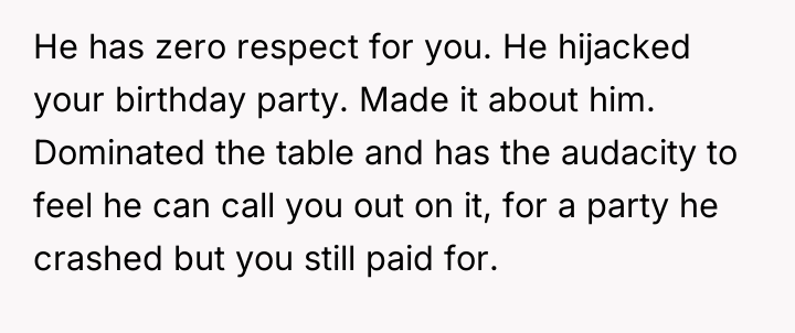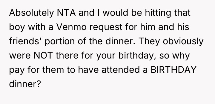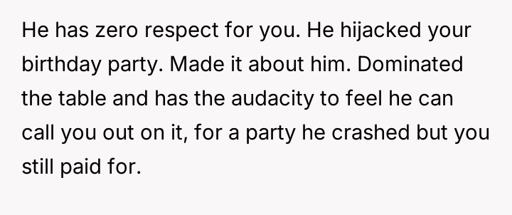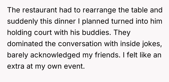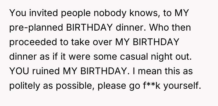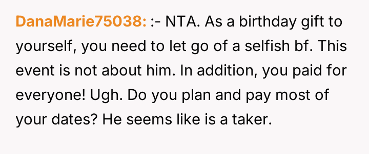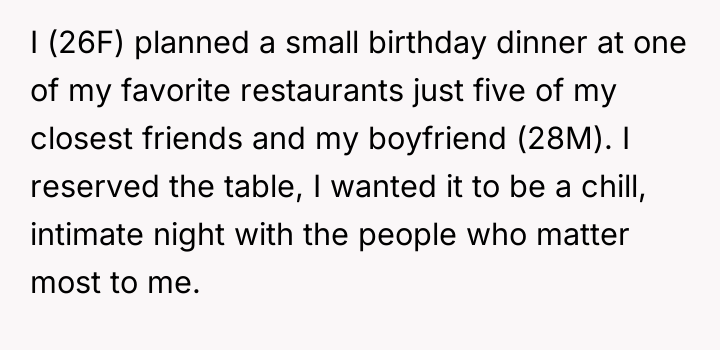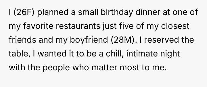The original poster (OP), a 26-year-old woman, arranged a small birthday dinner at her favorite restaurant for herself, her boyfriend (28M), and five of her closest friends. She specifically planned this event to be an intimate and relaxed evening with the people most important to her.