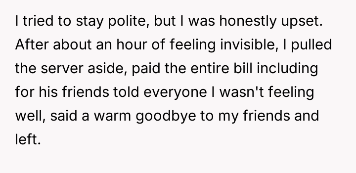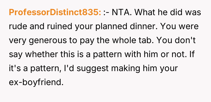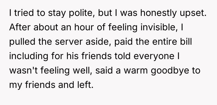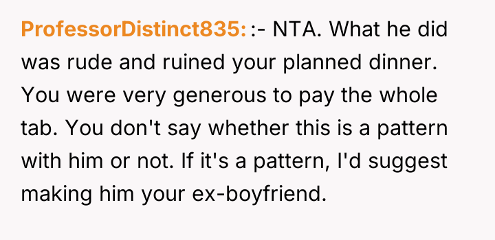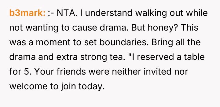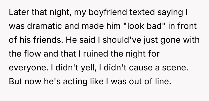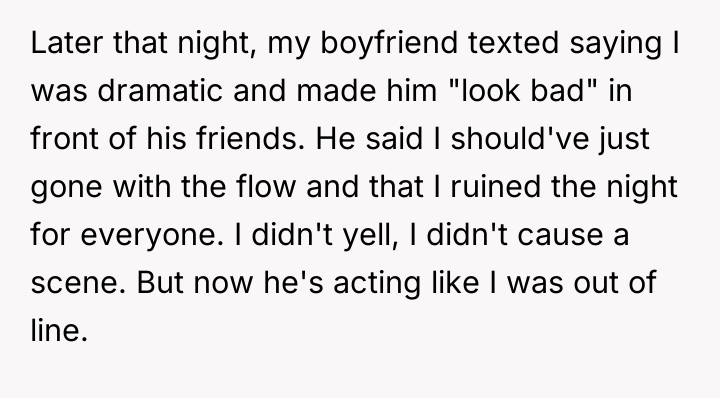 When the boyfriend arrived, he brought three additional friends whom the OP barely knew, without any prior warning or asking permission. This action altered the planned intimate setting, as the new guests dominated the conversation with inside jokes, overshadowing the OP and her original friends. Feeling ignored and upset by this change, the OP quietly paid the entire bill, claimed she felt unwell, and left the dinner early, leading to a conflict with her boyfriend who later accused her of being dramatic.