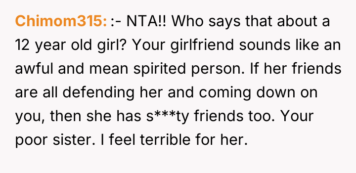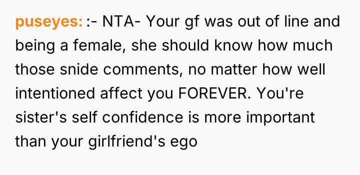 Was the OP justified in immediately prioritizing the defense of their younger sister over their girlfriend's feelings and the social expectations of their peer group, or did the delivery of their reaction constitute an unacceptable disrespect toward their partner? The core debate centers on whether protecting a minor from body-shaming comments overrides the requirement for respectful communication within an adult romantic relationship.