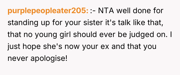 The subsequent social pressure for the OP to apologize to the girlfriend highlights a societal tendency to prioritize the feelings of an adult partner over the protection of a child from harmful commentary, especially concerning body image. While immediately ending the call was a strong communication method, it effectively shut down dialogue. The OP's action was appropriate in its intent—stopping the harmful speech—but the subsequent refusal to communicate or apologize risks the relationship. A constructive recommendation for the future would be to firmly address the boundary violation privately after the immediate situation is de-escalated, for example: “What you said about my sister was unacceptable and crossed a line. We need to discuss why that comment was harmful before we can move forward.”