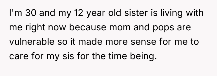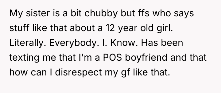 The original poster (OP) is facing a conflict rooted in their protective instinct toward their 12-year-old sister, particularly regarding comments made by their girlfriend about the sister's weight. The OP acted decisively to defend their sister, but this action led to social backlash, with friends and family criticizing the OP for disrespecting the girlfriend rather than supporting the OP's defense of the child.