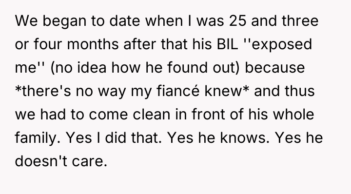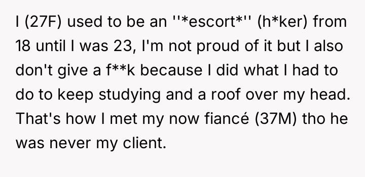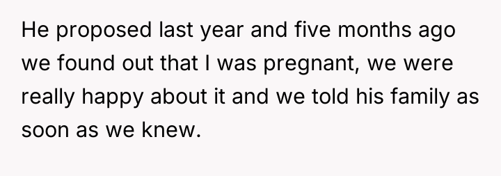 The original poster (OP) is facing continued judgment and suspicion from her fiancé's family based on her past profession, despite her fiancé's support and their commitment to starting a family. Her reaction during the family gathering was an assertion of her position against a thinly veiled insinuation about the paternity of her unborn child, which resulted in confrontation and a demand for an apology.