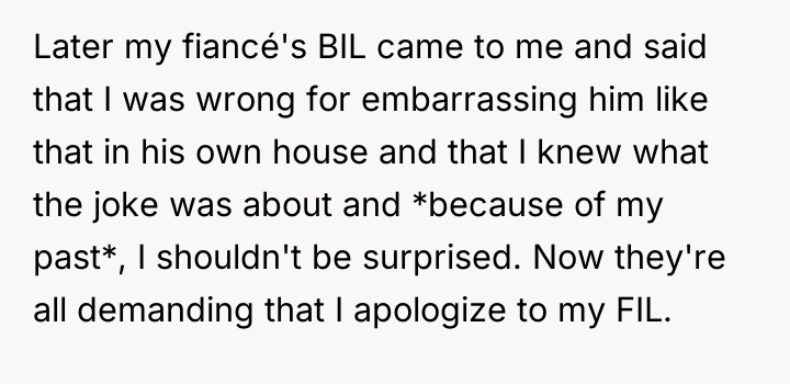 The OP’s immediate response, demanding an explanation for the joke, served to expose the underlying hostility. While this resulted in immediate conflict, it forcefully shut down the coded language that the family has repeatedly used since learning of her past. The family's continued focus on her past, manifesting in policing behavior years ago and now questioning the paternity of her child, demonstrates a failure by the fiancé's family unit to establish firm boundaries around accepting the OP as their son's partner.