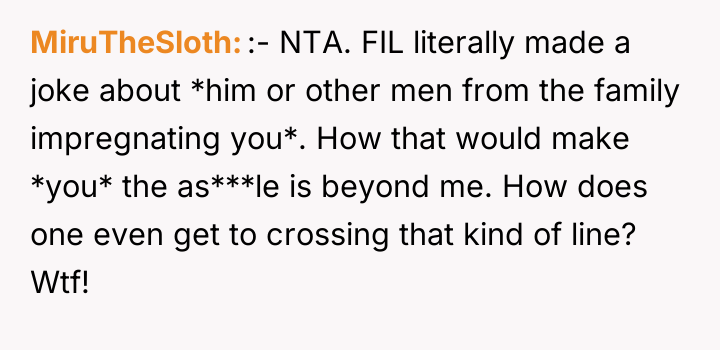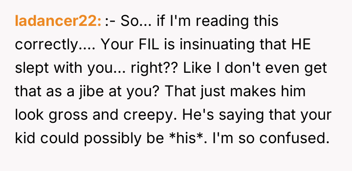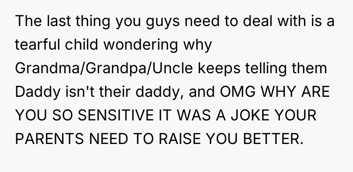 As renowned family therapist Dr. Harriet Lerner explains, "When someone is acting out, they are communicating something that they cannot say directly." In this situation, the father-in-law (FIL) and the brother-in-law (BIL) are communicating deep-seated insecurity and prejudice regarding the OP’s past, using thinly veiled 'jokes' about paternity to express disapproval that they are unwilling or unable to state openly.