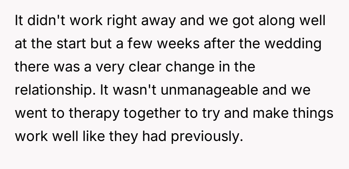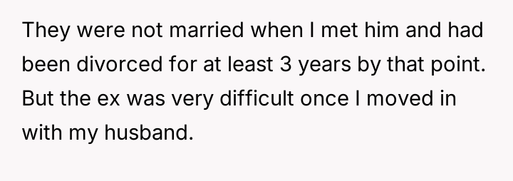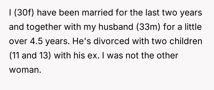 The user, a 30-year-old female, has been married to her 33-year-old husband for two years, having been together for over four and a half years. Her husband has two children, aged 11 and 13, from a previous marriage. The relationship with the ex-wife became difficult after the user moved in, although initial contact was managed through reduction.