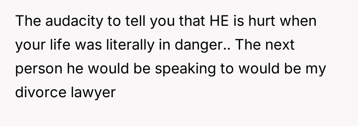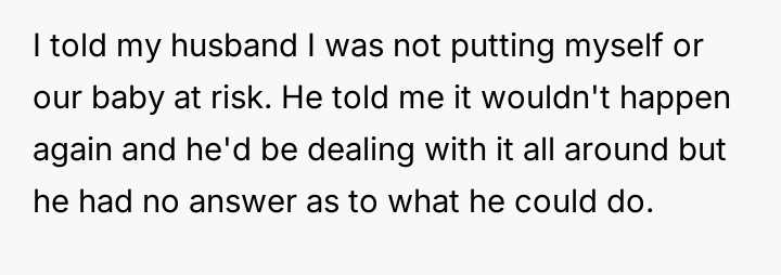 The user is currently feeling conflicted, questioning if her decision to involve CPS and leave the marital home was an overreaction, despite having experienced direct threats and an attempted act of harm toward her and her unborn baby. Her primary concern remains the safety of her child, which contrasts sharply with her husband's and his family's reaction that she 'took it too far.'