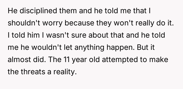 The core issue here transcends typical co-parenting or step-parenting challenges; it involves credible threats of physical harm against a pregnant woman and an unborn child. The husband’s initial response, characterized as being 'too blasé' and lacking a concrete safety plan after an actual attempt on safety occurred, indicates a severe failure in prioritizing his wife and unborn child's immediate security. When children are actively encouraged or influenced by an external party (the ex-wife) to make threats of violence, those threats must be treated as an immediate crisis, not merely a disciplinary issue.