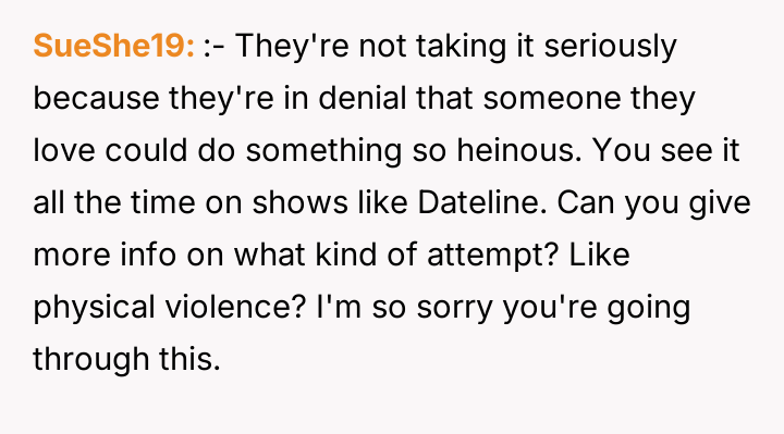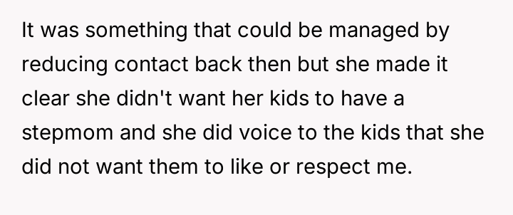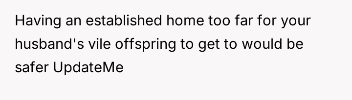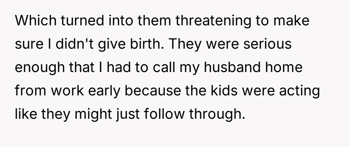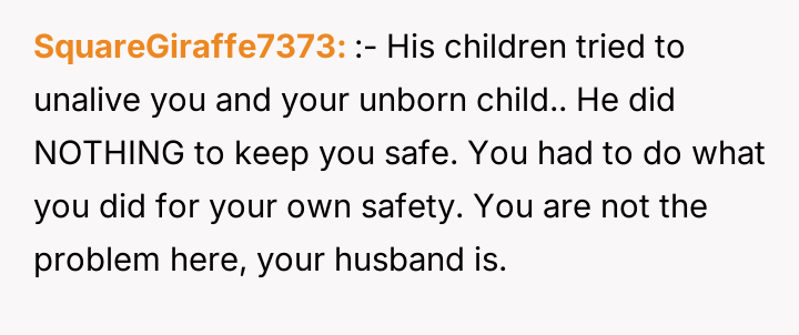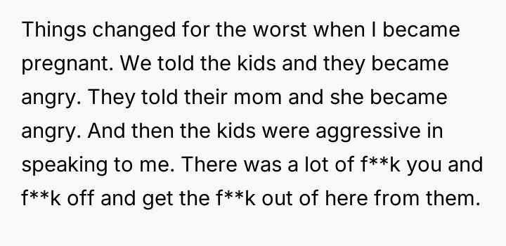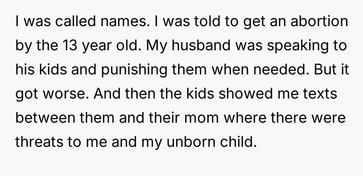 The situation escalated significantly after the user became pregnant. The husband's children reacted with anger, using aggressive language toward the user, including telling her to get an abortion. The children showed the user text messages from their mother which contained threats against the user and her unborn child. Following an attempt by the 11-year-old to act on these threats, the user reported the situation to Child Protective Services (CPS) and moved in with her parents, leaving her husband in doubt about her decision.