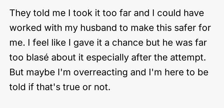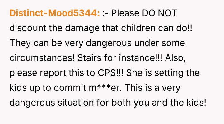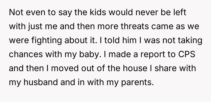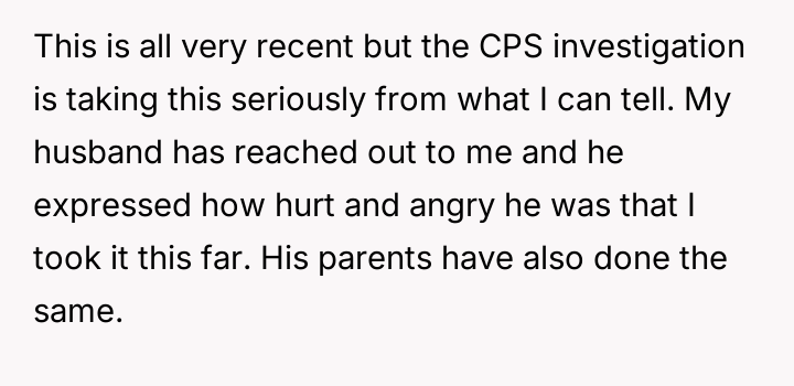 The user’s action to report to CPS and temporarily separate was a necessary, self-protective measure rooted in establishing a firm boundary against violence. It is inappropriate for the husband or his parents to frame this as an escalation, as the escalation originated from the children’s threats and actions. Moving forward, the constructive recommendation is for the user to maintain separation until CPS investigation is complete and robust, enforceable safety protocols—including clear boundaries enforced by the husband and professional intervention for the children—are firmly in place and respected by all parties.