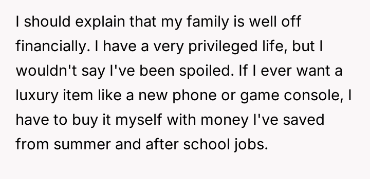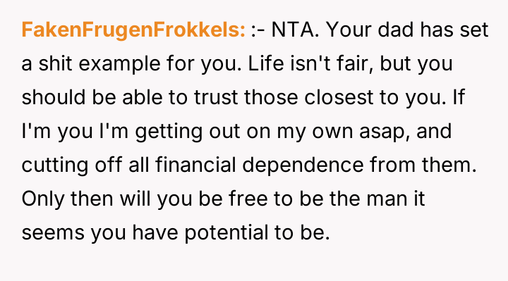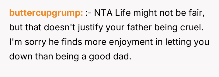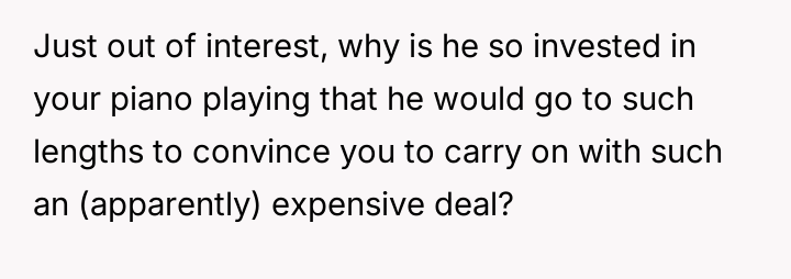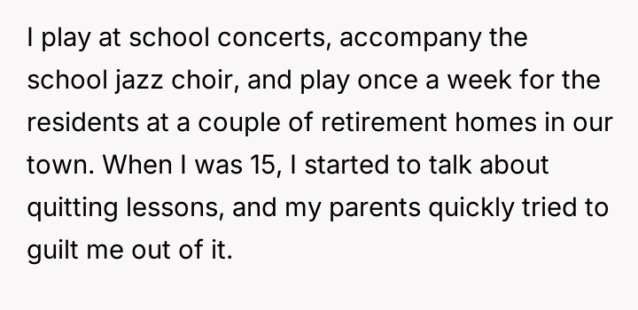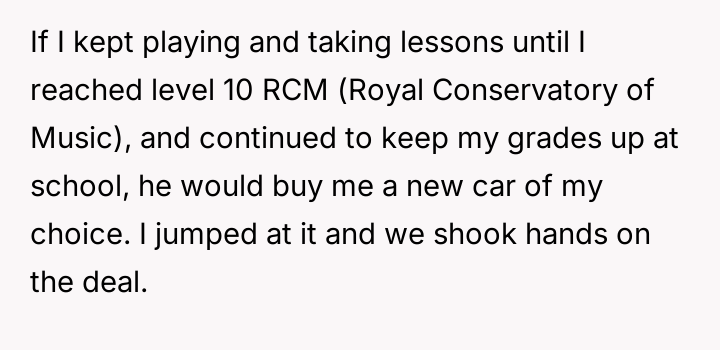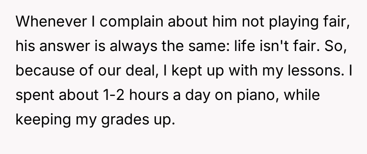 The father’s action was a calculated breach of trust, utilizing linguistic ambiguity (the 'loophole') to avoid the true intent of the agreement. This behavior is often rooted in a need for control or deriving amusement from dominating interactions, as evidenced by his enjoyment of the resulting distress and his recurring justification, 'life isn't fair.' For the 17-year-old user, this betrayal moves beyond a simple broken promise; it invalidates years of diligent effort made under the premise of an honest contract. The user’s emotional labor in maintaining the piano commitment, while balancing academics and community service, was exploited.
