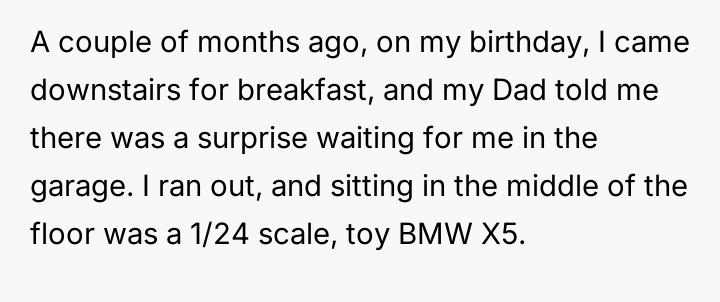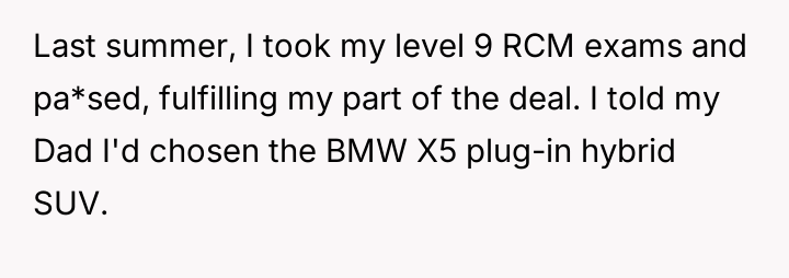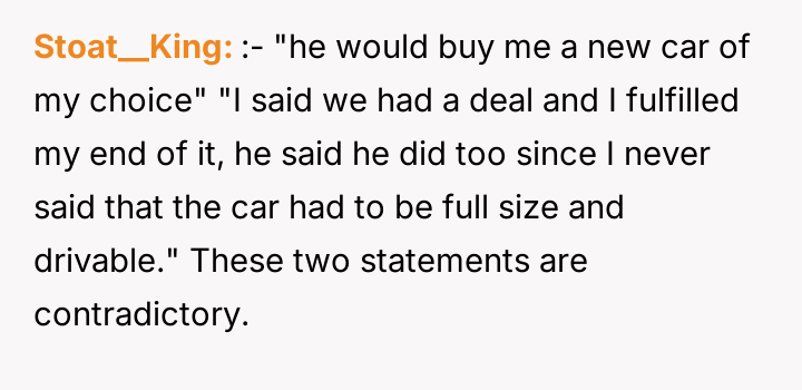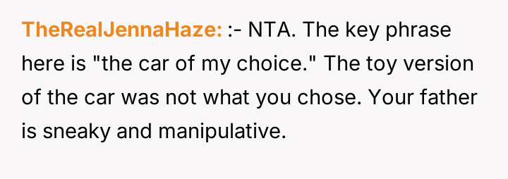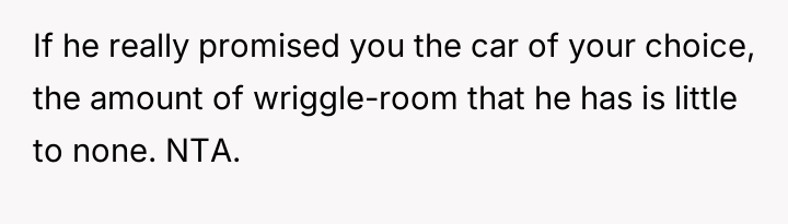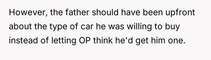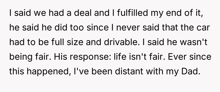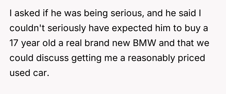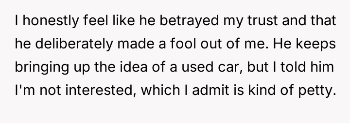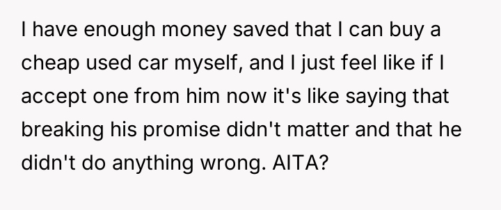 The user's current stance—refusing the used car offer—is an understandable, albeit emotionally charged, attempt to enforce a boundary and seek accountability for the father's misconduct. However, accepting a substitute vehicle now would be interpreted by the father as forgiveness without consequence. The constructive path forward involves the user clearly articulating that the value lost was the trust and respect, not just the car. They should state they will buy their own vehicle, perhaps using the promised car's monetary value as a separate fund, but only after the father genuinely acknowledges the maliciousness of his deception, rather than just the technicality of the agreement.