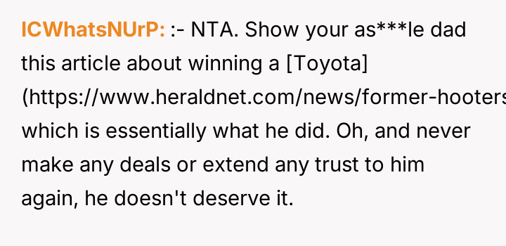 Given the father's history of exploiting loopholes and his dismissive attitude about fairness, is the user justified in refusing any subsequent offer of a used car from his father, or should they accept a lesser recompense to move past the conflict?