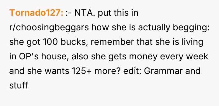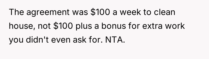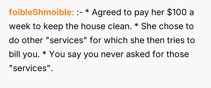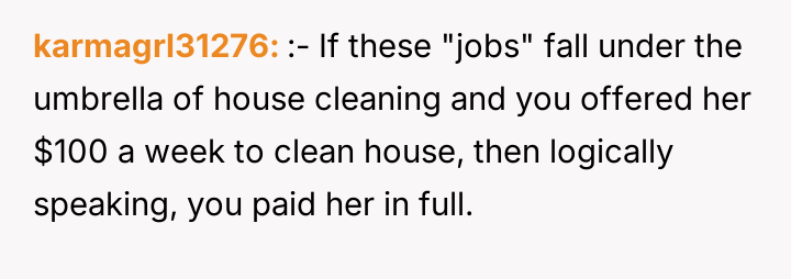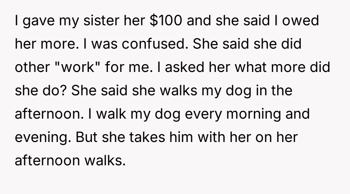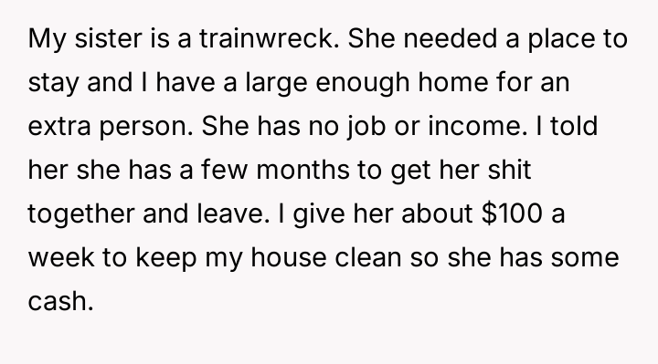 The OP’s action of evicting the sister was an extreme response to a boundary violation, though understandable given the feeling of being cornered financially and morally. A more constructive initial approach would have been to firmly refuse the retroactive charges, clearly state that only the agreed-upon $100 payment stands, and then proceed with the pre-established timeline for her departure. In future familial arrangements, explicitly defining what services are expected for housing support versus what constitutes paid, external labor is essential to prevent such volatile disagreements.