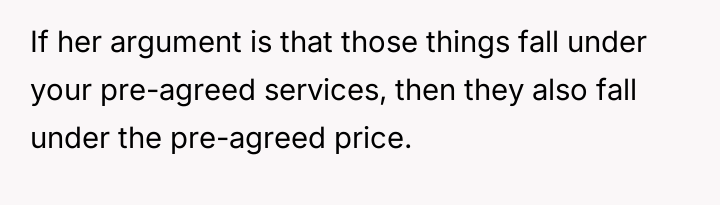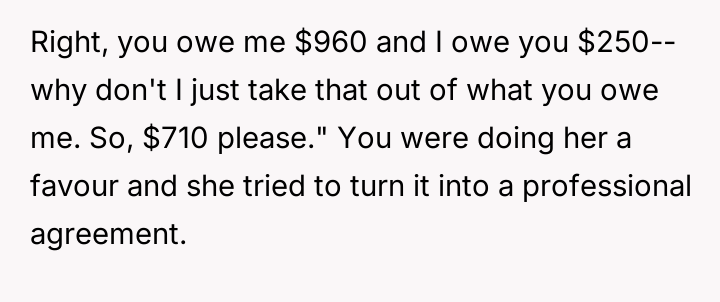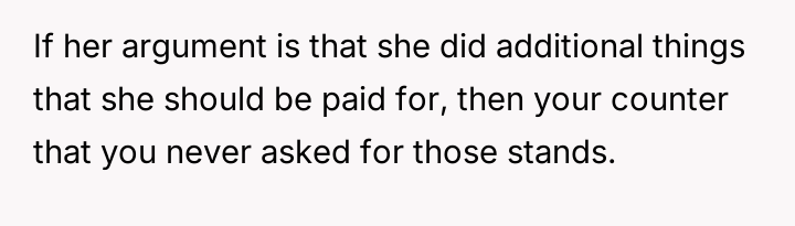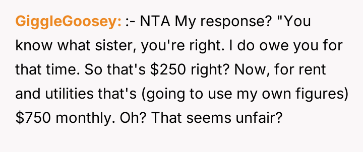 The original poster (OP) prioritized maintaining clear transactional boundaries and felt disrespected when their sister tried to retroactively charge for unapproved services, leading to the immediate termination of the living arrangement. The central conflict arose because the sister viewed minor, unrequested activities as compensable work falling under a vague agreement, while the OP viewed them as unauthorized personal projects exceeding the agreed-upon terms for shelter.