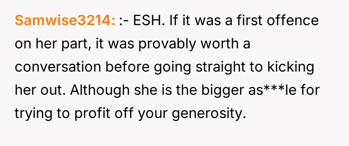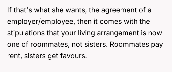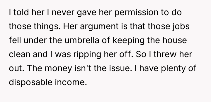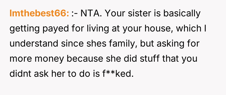 Was the OP justified in immediately evicting their sister over a disagreement about retroactive payment for unauthorized tasks, or did the initial provision of shelter obligate a more structured negotiation before expulsion? The core question remains whether an informal agreement for housing and light chores nullifies the need for mutual consent on additional paid labor.