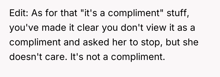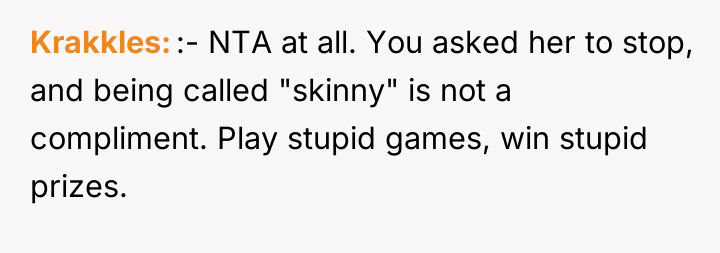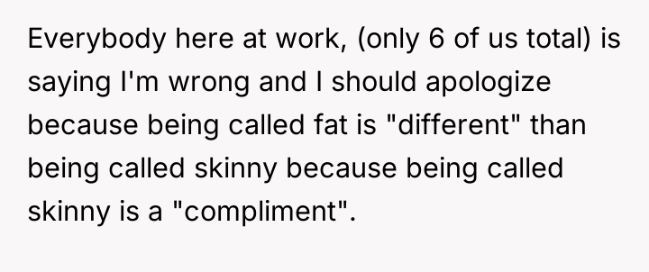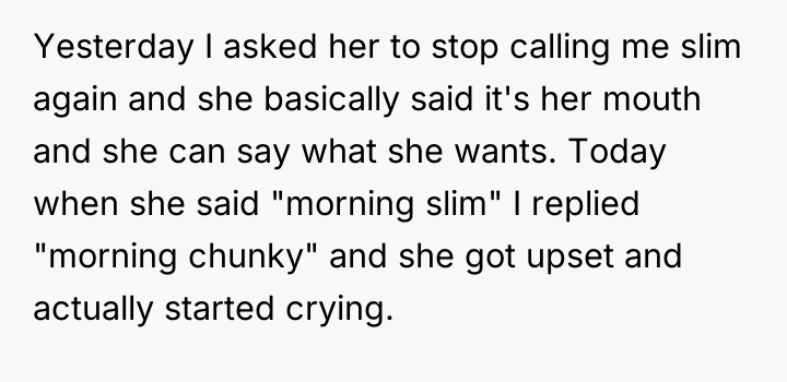 AITA For calling my co-worker "chunky" after she repeatedly calls me "slim" and makes references to my weight after I asked her multiple times not to.