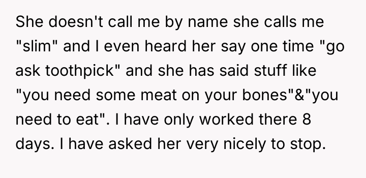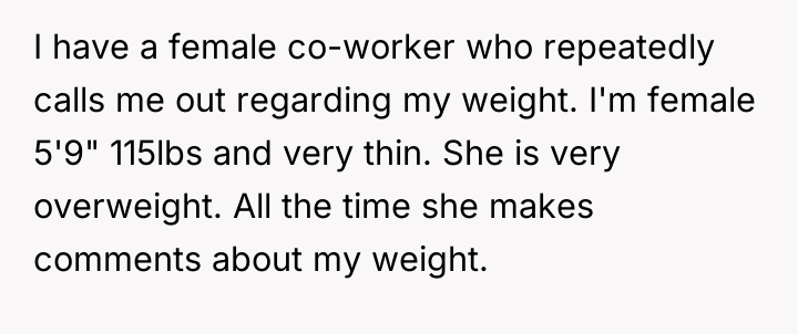 In a tense workplace charged with unspoken judgments, a young woman finds herself trapped under the weight of relentless comments about her slender frame. Despite her polite requests for respect, her co-worker’s barbed remarks slice through each day, leaving her feeling exposed and belittled in a place she had hoped for camaraderie.