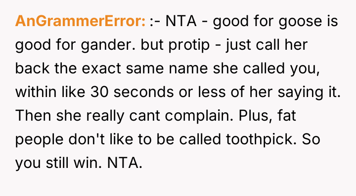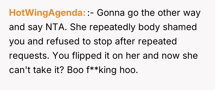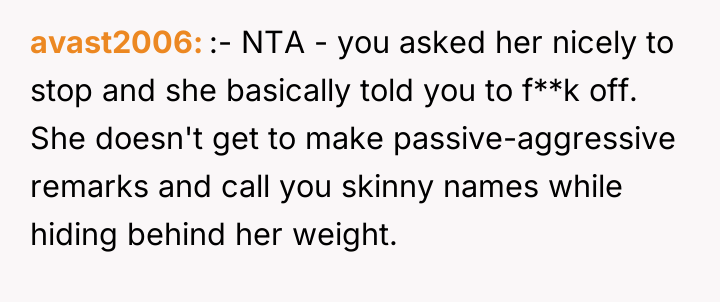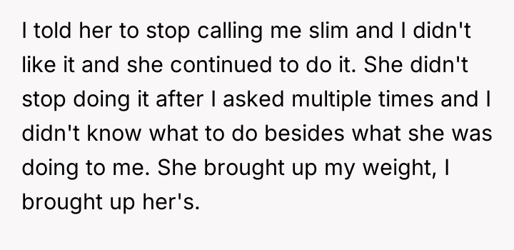 The original poster (OP) faced repeated comments about their weight from a coworker, leading to a situation where the OP retaliated in kind after initial requests to stop were ignored. The central conflict lies between the OP's desire for respectful boundaries at work and the coworker's refusal to cease the commentary, which was then met with reciprocal name-calling.