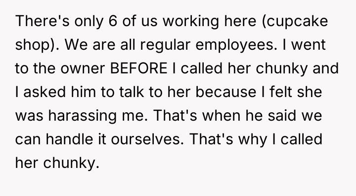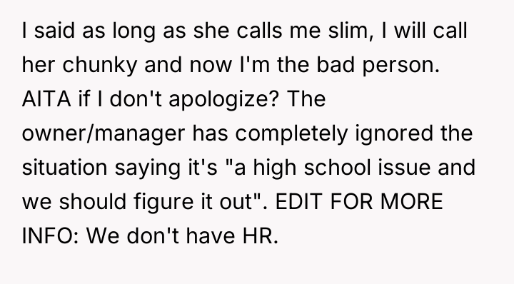 As renowned researcher Dr. Brené Brown explains, “Boundaries are the distance at which I can love you and me simultaneously.” In this workplace dynamic, the coworker clearly failed to respect the OP’s professional boundaries by repeatedly commenting on the OP's body size, using dehumanizing nicknames like "slim" and "toothpick." The OP's initial approach—asking nicely to stop—was appropriate, but when this failed, the coworker effectively signaled that only a reciprocal action would halt the behavior. The OP's decision to retaliate by calling the coworker "chunky" was an understandable, albeit counterproductive, escalation rooted in frustration and feeling unheard, especially since management explicitly abdicated responsibility by labeling it a "high school issue." While the OP's action was a direct response to ongoing harassment, mirroring the harassment often shifts the focus away from the initial aggressor's behavior. The coworker's subsequent emotional reaction (crying) is irrelevant to the appropriateness of the initial boundary violation. From a professional standpoint, the OP’s behavior was an inappropriate response to harassment, as it introduced new hostility into the environment. The most constructive way forward, even without HR, is to document every instance of name-calling and body commentary, present this documentation to the owner again, and clearly state that if the harassment does not cease, the OP will have to seek external avenues (like labor boards or escalating the issue formally). Until then, the OP should cease all reciprocal name-calling and maintain strictly professional communication.