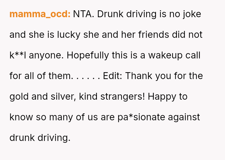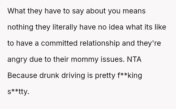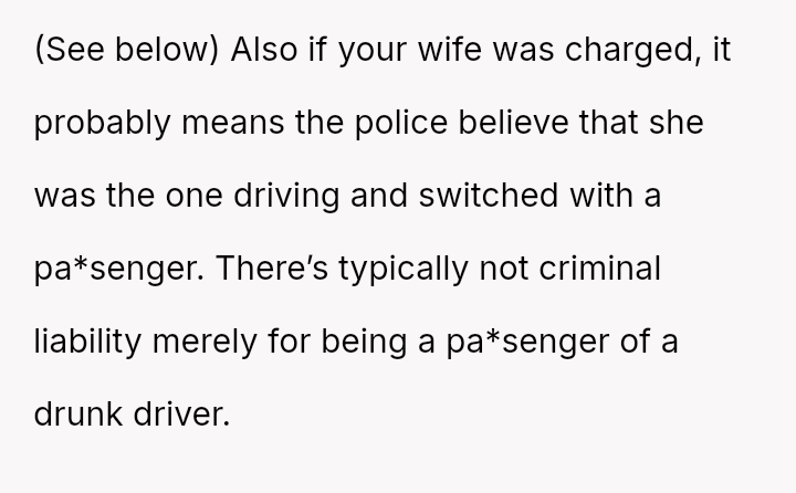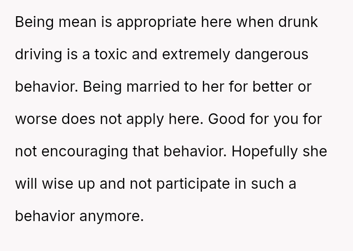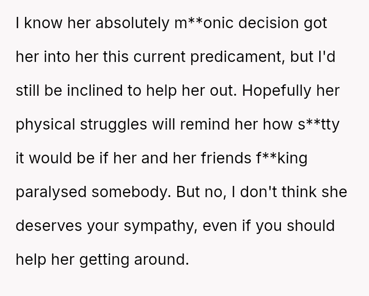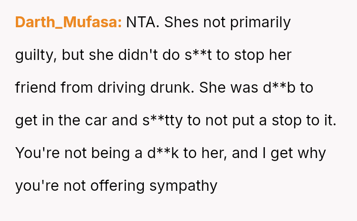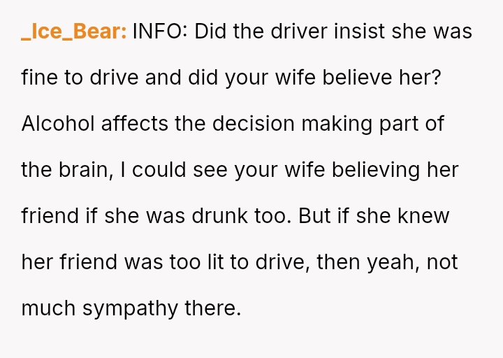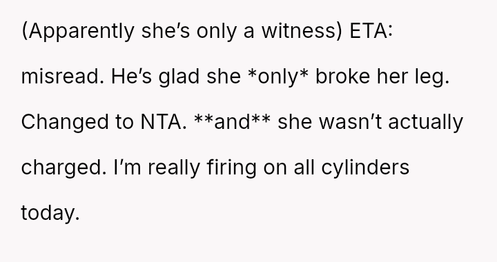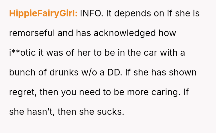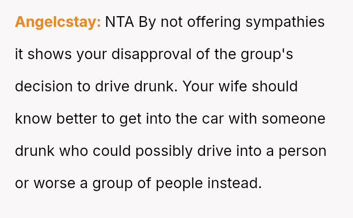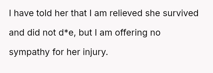 The original poster is experiencing a deep conflict between his relief that his wife survived a serious accident and his refusal to offer sympathy for her resulting broken leg, stemming from his judgment regarding her drunk driving.