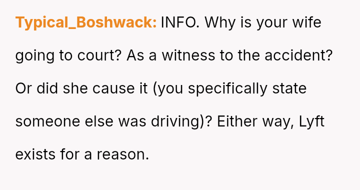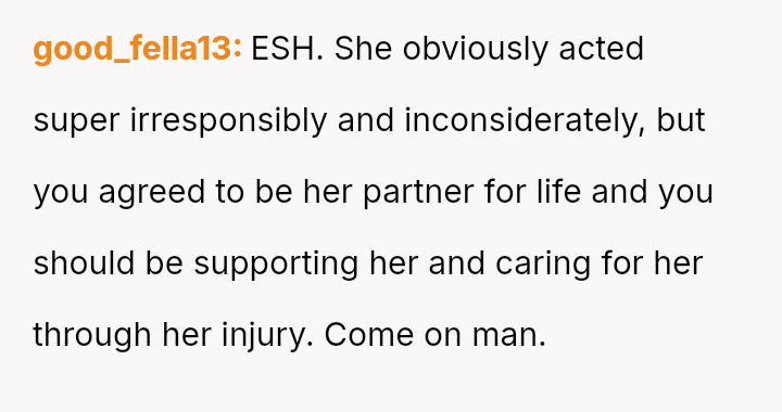 The central conflict lies in his belief that her injury is a deserved consequence of her poor choices, while his wife expects emotional support during her recovery, regardless of the cause of the injury.