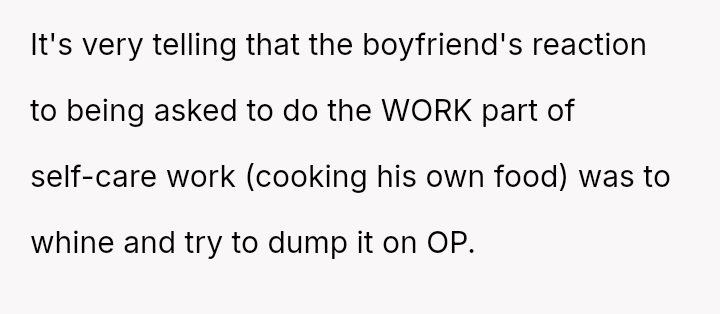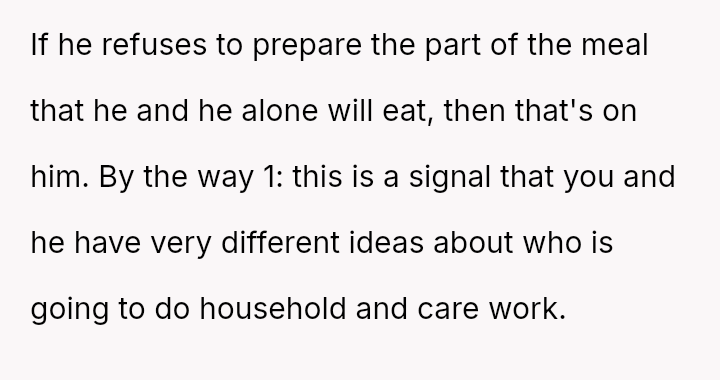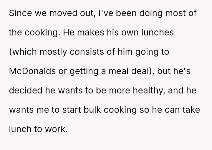 He wanted to change, to eat healthier, and looked to her for support in ways that challenged her principles and sense of safety. What started as a simple request for bulk cooking to improve his lunches stirred a quiet storm of discomfort and tension.