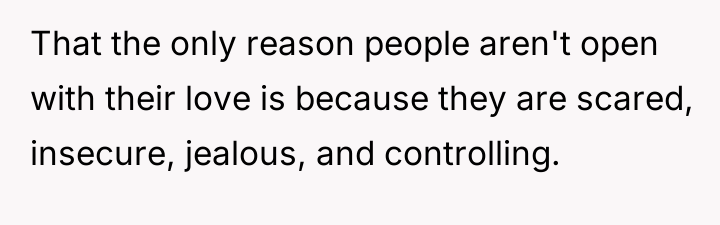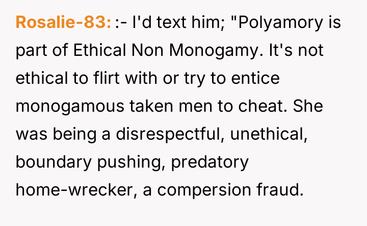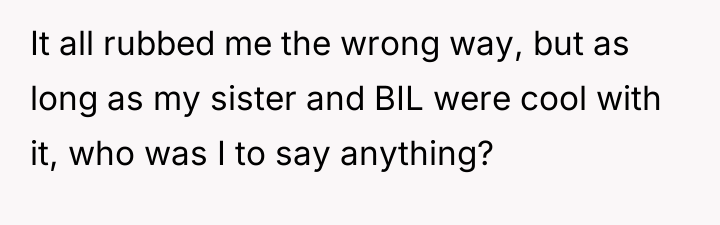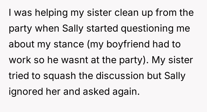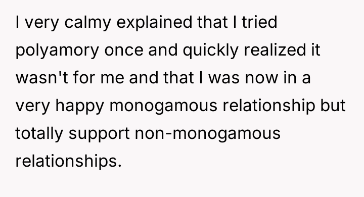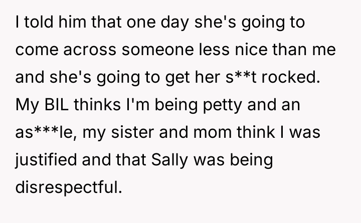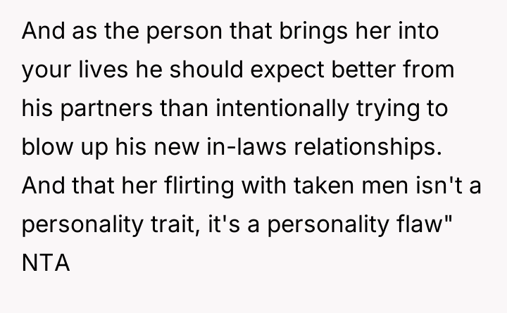 The OP's swift and harsh verbal response to Sally was an immediate, albeit emotionally charged, defense of their personal boundary concerning their relationship integrity. Sally's behavior—cornering the OP's boyfriend and physically engaging in a flirtatious manner—is a clear violation of social etiquette and respect for an established relationship, regardless of Sally's personality traits. The BIL's demand for an apology frames Sally’s actions as permissible, shifting the accountability onto the person who defended their partner. This dynamic suggests a potential power imbalance where the sister’s new relationship structure is being used to excuse behavior that would be widely condemned in a purely monogamous context.