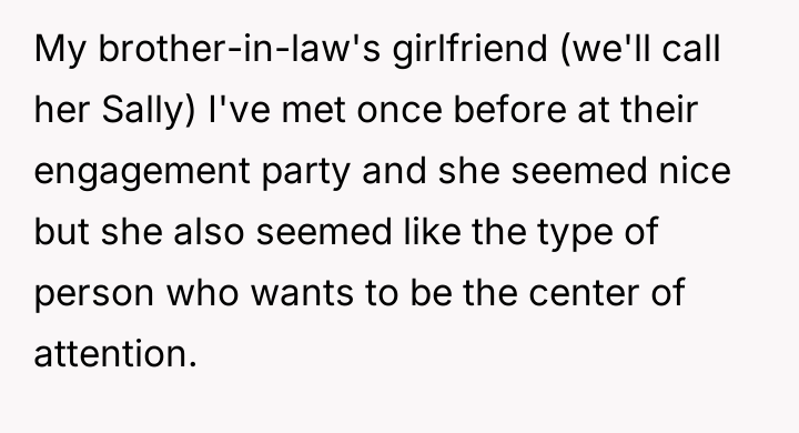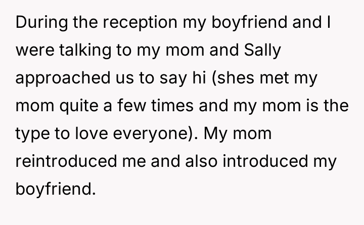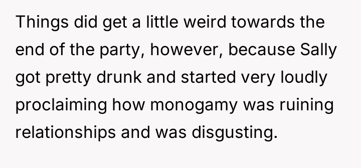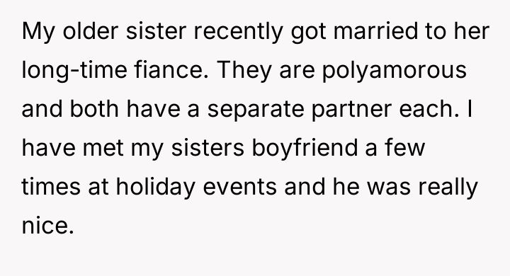 The original poster (OP) recounts events following their older sister's wedding to her long-time fiancé, noting that the sister and her new husband are polyamorous, each having a separate partner. The OP had met the sister's boyfriend previously, but the brother-in-law's girlfriend, referred to as Sally, seemed overly attention-seeking during an earlier engagement party.